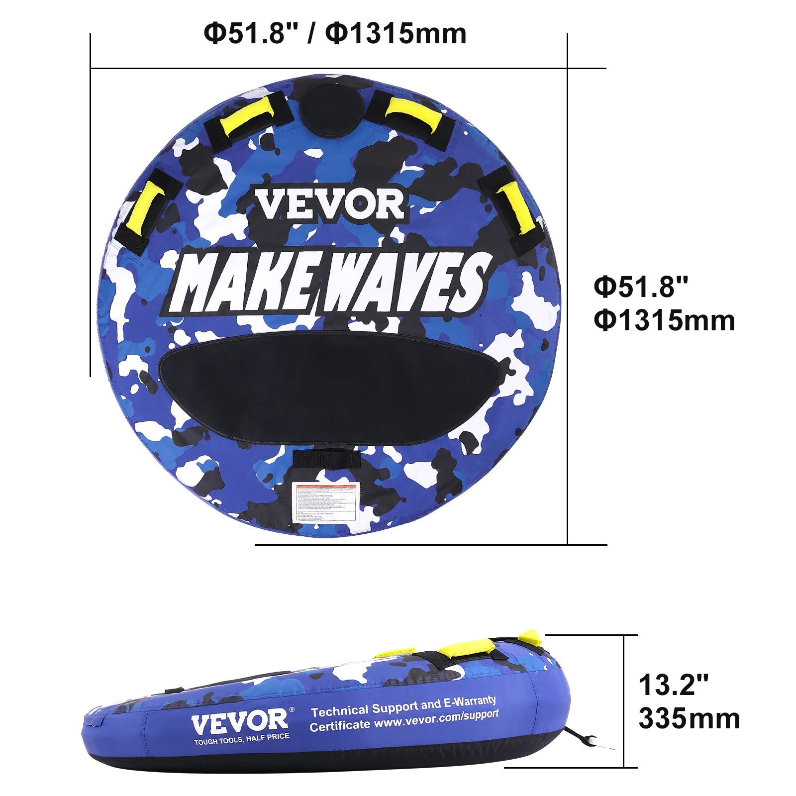 • Durable & High-Quality Materials:Built to last, this towable tube features strong 840D nylon on the bottom and 420D nylon on the back, offering excellent resistance against UV rays, aging, and punctures. The durable fabric ensures that the vibrant design stays intact and fade-resistant, no matter how many hours of fun you have on the water.